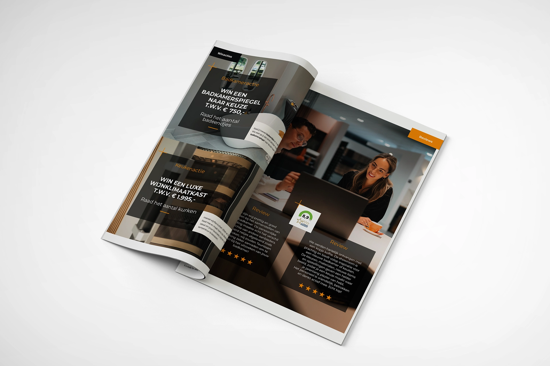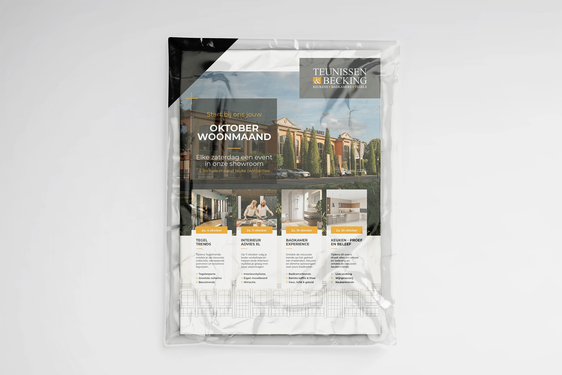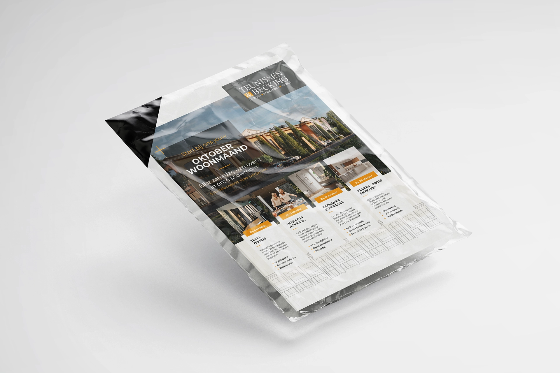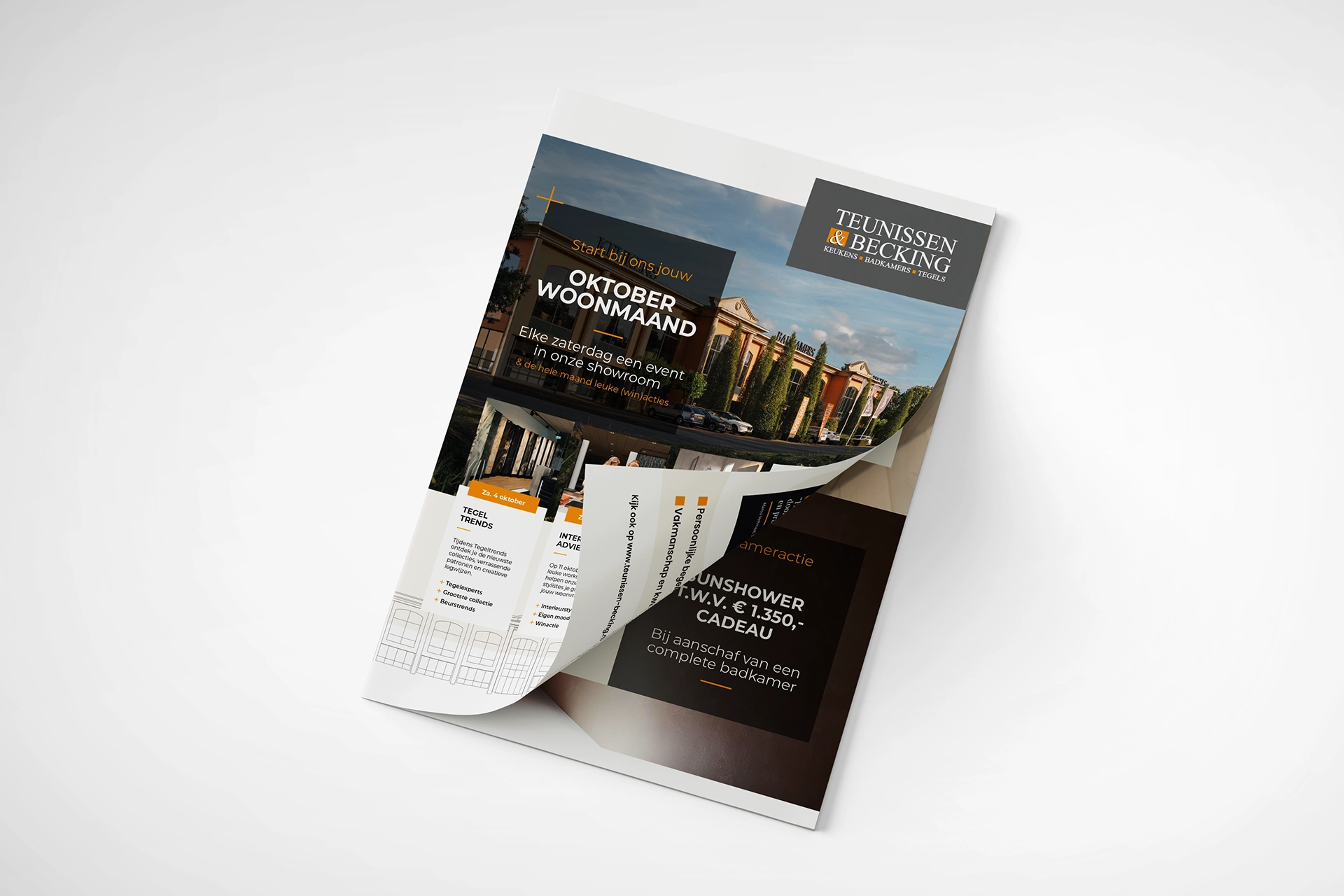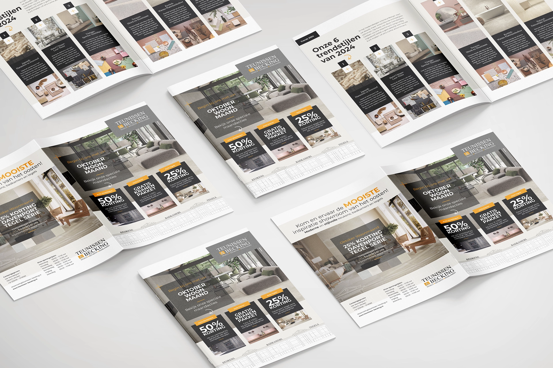 Een sterk merk herken je aan consistentie. Voor Teunissen & Becking vertaalden we die gedachte naar een terugkerend communicatiemiddel dat inspireert én verkoopt. Elk seizoen brengen we een 12-pagina’s folder tot leven waarin de nieuwste trends in keukens, badkamers en tegels samenkomen in een herkenbare stijl. Van concept en design tot verspreiding: we bewaken het hele traject, zodat elke uitgave voelt als een verlengstuk van de showroom. De folders zijn inmiddels uitgegroeid tot een vast moment van inspiratie aan huis — een visitekaartje dat klanten telkens opnieuw prikkelt. Daarnaast zorgen we ervoor dat alle merkuitingen, van briefpapier tot beursmateriaal, dezelfde heldere signatuur dragen. Zo blijft Teunissen & Becking niet alleen zichtbaar, maar ook betrouwbaar, herkenbaar en dichtbij.